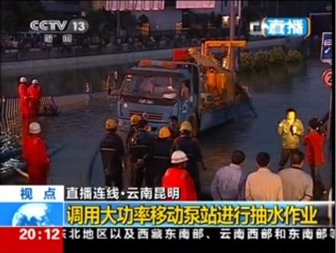 據央視7月19日“東方時空”新聞報道,從2013年7月18日早7點開始,云南昆明市降下了近4年以來最大的暴雨,12小時降雨量達190毫米,城區多處積水,交通受到嚴重影響。流經城區的盤龍江流量是正常時期10倍左右,水位大幅上漲,導致江水倒灌。緊靠盤龍江的火車北站隧道是市區最大的淹水點,這條長300多米的汽車和行人通道積水20000立方米左右,最深處達5米。昆明市排水公司調來了全市唯一一臺大功率移動排水泵站投入搶險,經過一夜的連續工作,在早高峰前排清了積水,恢復了該城市主干道交通。