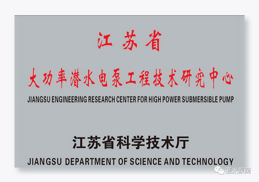 亞太泵閥有限公司是專(zhuān)業(yè)從事大功率潛水電泵及泵站系統(tǒng)研究的國(guó)家高新技術(shù)企業(yè),企業(yè)先后獲批國(guó)家博士后科研工作站、江蘇省企業(yè)技術(shù)中 心、江蘇省大功率潛水電泵工程技術(shù)研究中心、江蘇省研究生工作站等省級(jí)平臺(tái),技術(shù)創(chuàng)新能力顯著增強(qiáng),先后獲得國(guó)家科技二等獎(jiǎng)1項(xiàng)、省部級(jí)科技進(jìn)步獎(jiǎng)12項(xiàng)、承擔(dān)國(guó)家和省級(jí)研發(fā)項(xiàng)目11項(xiàng)、主持和參與制訂國(guó)家和行業(yè)標(biāo)準(zhǔn)8項(xiàng)。此次成功獲批省特大型潛水電泵及泵站系統(tǒng)工程研究中心,成為亞太泵閥第5個(gè)省級(jí)以上研發(fā)平臺(tái)。